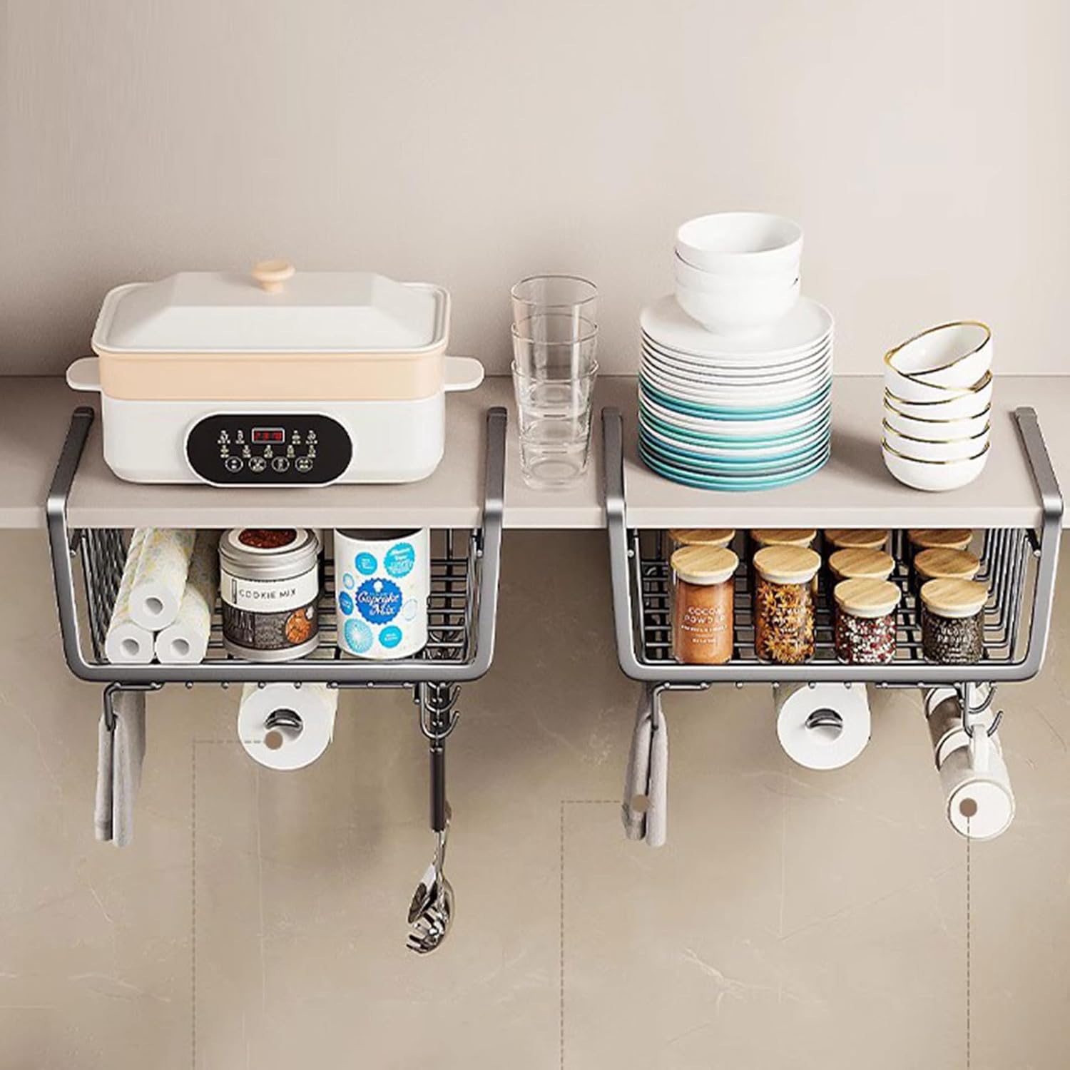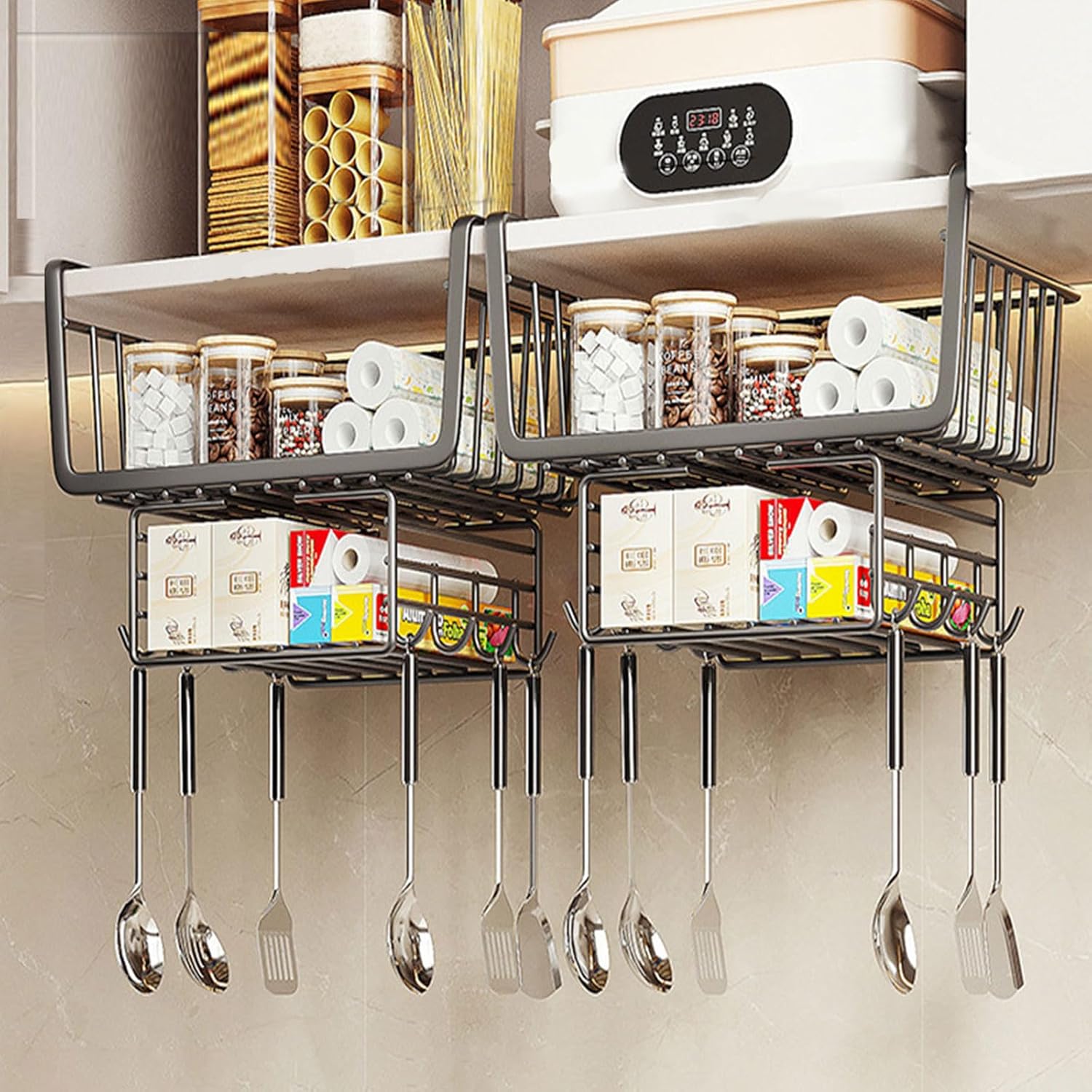 - High-quality Design - Bottom pull-up design to protect items from falling, easy to visualize and access; Tight mesh design, strong and durable, wire thickness up to 3mm, stronger than other 2mm wire on the market..Usage - Suitable for shelves in cabinets, pantry rooms and bathrooms; Holds cups, cutlery, food packaging, spices, napkins, cutlery and any items.